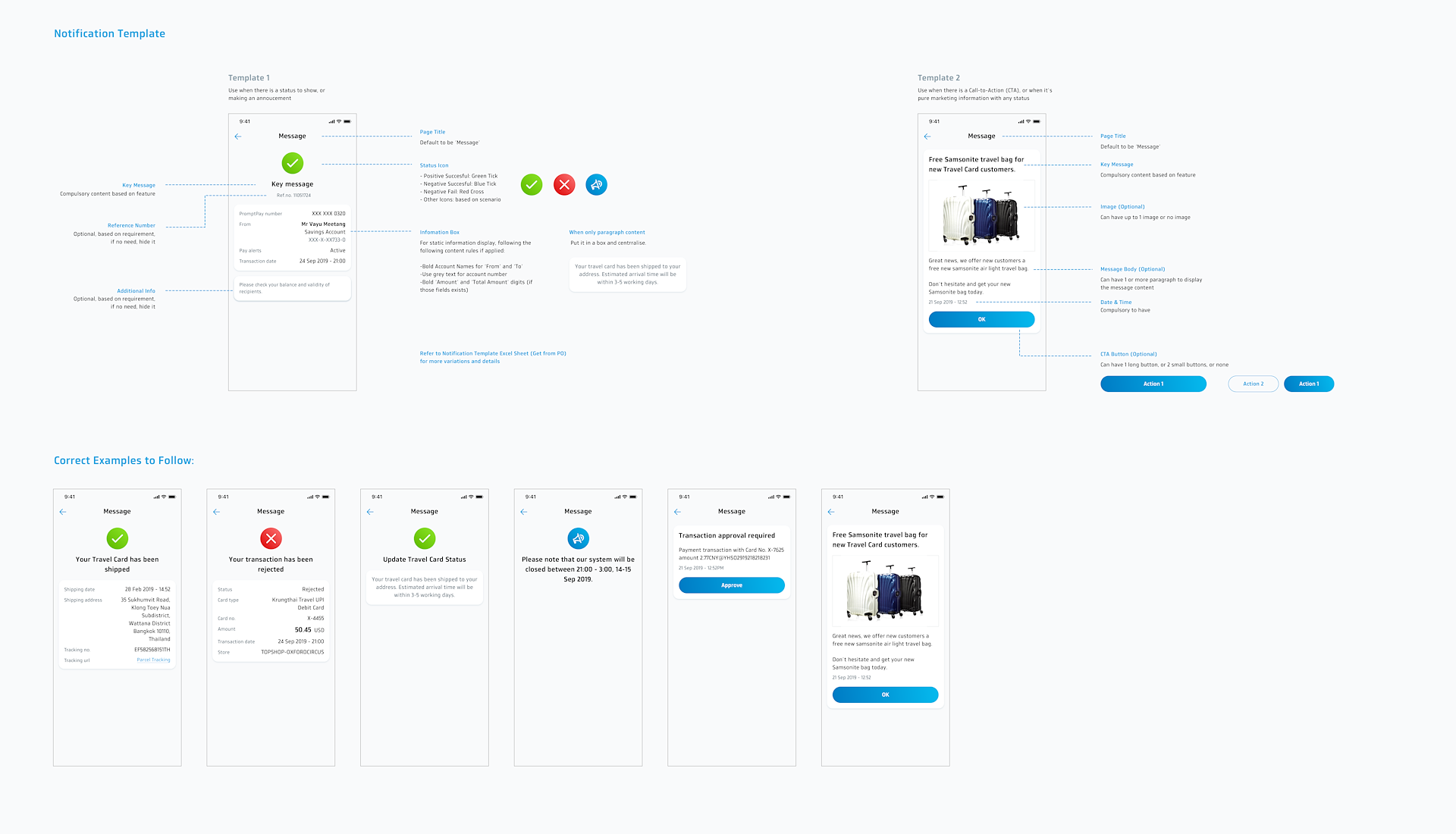 A notification template was also created for future usage. This was created with scalability in mind – so that future designers would not need to create specific screens for each case with a different copywriting. This drastically reduces the time required and is a much more efficient workflow.