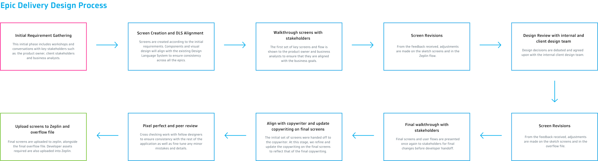 Working closely with the Business Analysts (to challenge the business flow and ensure that it has the users in mind) and Visual Designer (to ensure consistency with the Design Language System *DLS), I proceeded to create the screens for this epic.