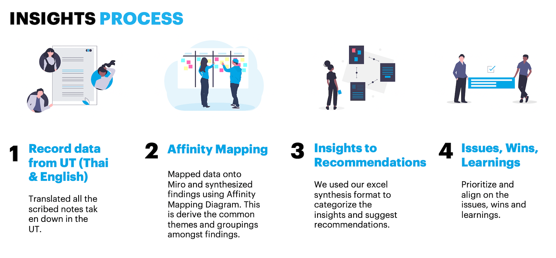 This was how we tackled the data collection -> insights process of the UT. One of the key challenges was that the UT had to be conducted in a bilingual way, hence for each set of data, we had to ensure the translation was accurate and precise.